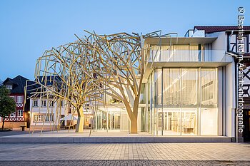 Am Marktplatz treffen Historie und Zukunft aufeinander: Das Archiv der Zukunft, das Privatvorhaben einer Lichtenfelser Unternehmerfamilie, ist ein spektakuläres architektonisches Kunstobjekt des renommierten Architekten Peter Haimerl und steht in Nachbarschaft zum 1743 von Justus Heinrich Dientzenhofer errichteten Rathaus. Zwei Weidenbäume aus Stahl, die sich über einen Glasbau wölben, erinnern an die traditionelle Korbflechterei, für die Lichtenfels bekannt ist, und verbinden Tradition und Innovation.