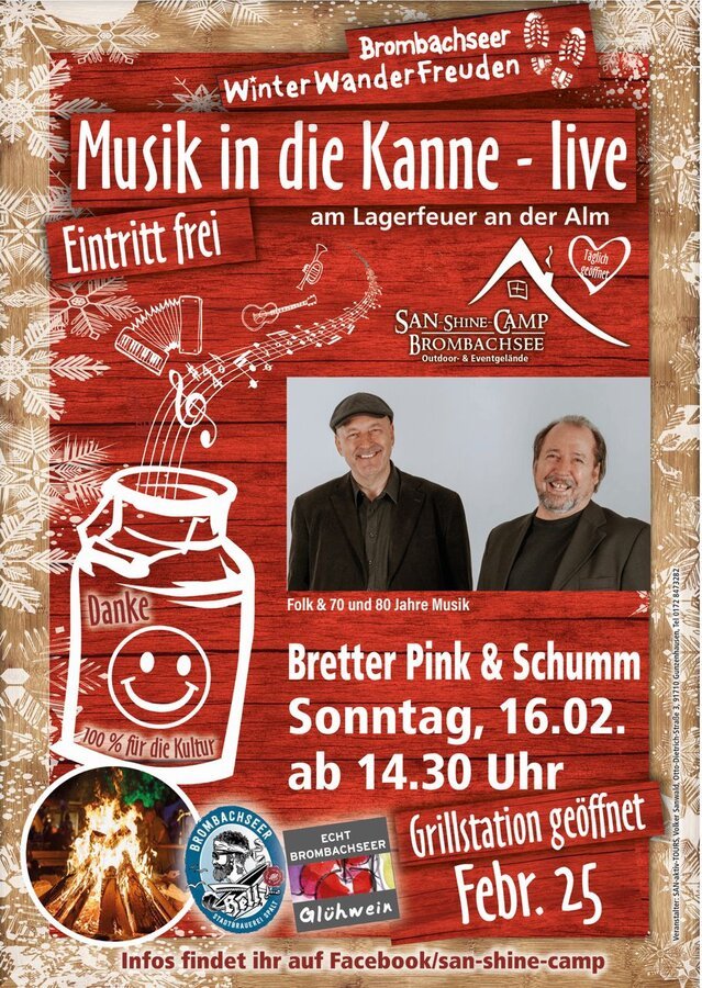 Die Sonntagsmusik in die Kanne spricht Wanderer, Pärchen, Spaziergänger mit Hund, aber auch Familien an. Am Freitag finden sich Einheimische, Hotelgäste oder Wohnmobilisten zum gemütlichen Feierabendgetränk bei wechselnden Musikangebot von regionalen Künstlern am Lagerfeuer zusammen.