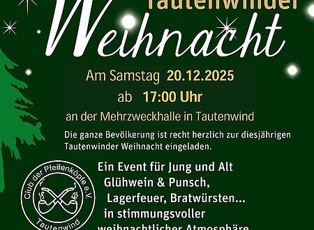 Die ganze Bevölkerung ist recht herzlich zur diesjährigen Tautenwinder Weihnacht eingeladen. Ein Event für Jung und Alt Glühwein & Punsch, Lagerfeuer, Bratwürsten... in stimmungsvoller weihnachtlicher Atmosphäre. Auf einen wunderbaren vorweihnachtlichen Abend freut sich die Vorstandschaft
