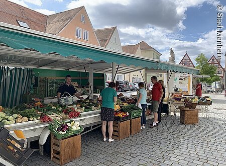 Jeden Freitag lädt der Wochenmarkt auf dem Monheimer Marktplatz dazu ein, frische und regionale Produkte einzukaufen. Aktuell werden regelmäßig alle Sorten von regionalem Obst und Gemüse sowie Bio-Backwaren und Bio-Käse angeboten. Je nach Saison stehen zusätzlich unterschiedliche Produkte - auch von weiteren Händlern - zum Kauf bereit, wie z. B. Spargel aus dem Ries.