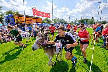 In Vorläufen, Hoffnungsläufen und Finalläufen wird der jeweils schnellste Esel ermittelt. Aber Vorsicht: Der Eseltreiber muss mit seinem Esel die Ziellinie überqueren und darf sich nicht abhängen lassen! Ein Reiterlauf vervollständigt das muntere Treiben.