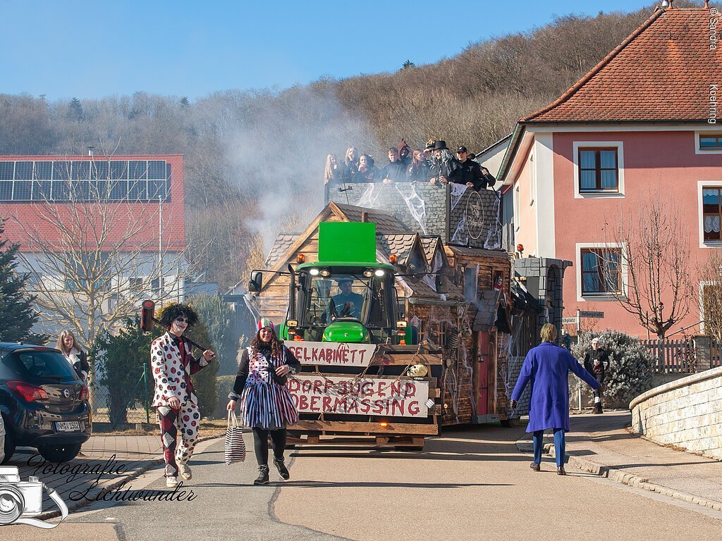 Ein kleiner und feiner Faschinxzug mit bunten Wägen, Fußgruppen, sowie der Blaskapelle Obermässing. Am Ende des Zuges werden am Dorfplatz die lustigen Missgeschicke in der Dorflitanei vorgetragen. Im Anschluss zieht das Prinzenpaar mit Tanzgruppen und Gästen zur Schulturnhalle, wo der Kinderfasching stattfindet.
