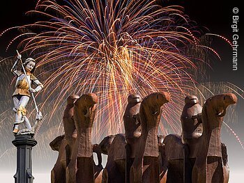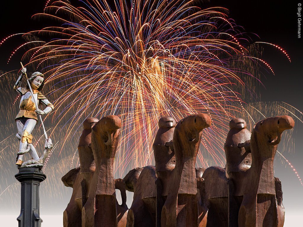 Noch einmal geht es um Neumarkts Brunnen. In der Pfalzgrafenstadt gab es im innerstädtischen und stadtnahen Bereich acht Brunnen, davon befanden sich drei auf dem Marktplatz. Die Führung informiert über die Konzeption des Brunnen- und Skulpturenprogramms, zum Schluss wird mit „prickelndem Wasser“ auf das neue Jahr angestoßen.